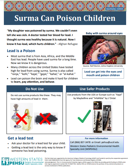 Surma is a traditional eye cosmetic, typically brought to the United States from other countries, and is used in various cultures, particularly in South Asia, Africa, and the Middle East, to darken the eyelids or as eyeliner. It is believed to have medicinal properties and is often applied for many reasons, including cultural or religious customs. Analysis revealed that many Surma samples contained high levels of lead, arsenic, and cadmium.
