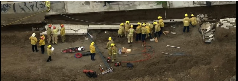 Exhibit 1. The incident scene depicting the trench in relation to the existing retaining wall. Photo courtesy of KTLA 5 News.