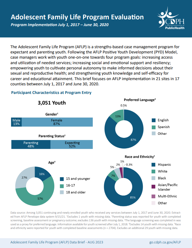 The Adolescent Family Life Program (AFLP) is a strengths-based case management program for expectant and parenting youth. Following the AFLP Positive Youth Development (PYD) Model, case managers work with youth one-on-one towards four program goals: increasing access and utilization of needed services; increasing social and emotional support and resiliency; empowering youth to cultivate personal autonomy to make informed decisions about their sexual and reproductive health; and strengthening youth knowledge and self-efficacy for career and educational attainment. This brief focuses on AFLP implementation in 21 sites in 17 counties between July 1, 2017 and June 30, 2020.