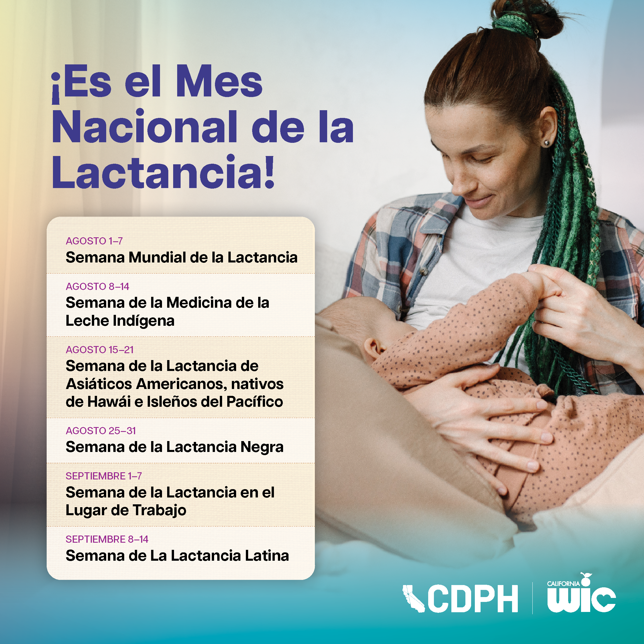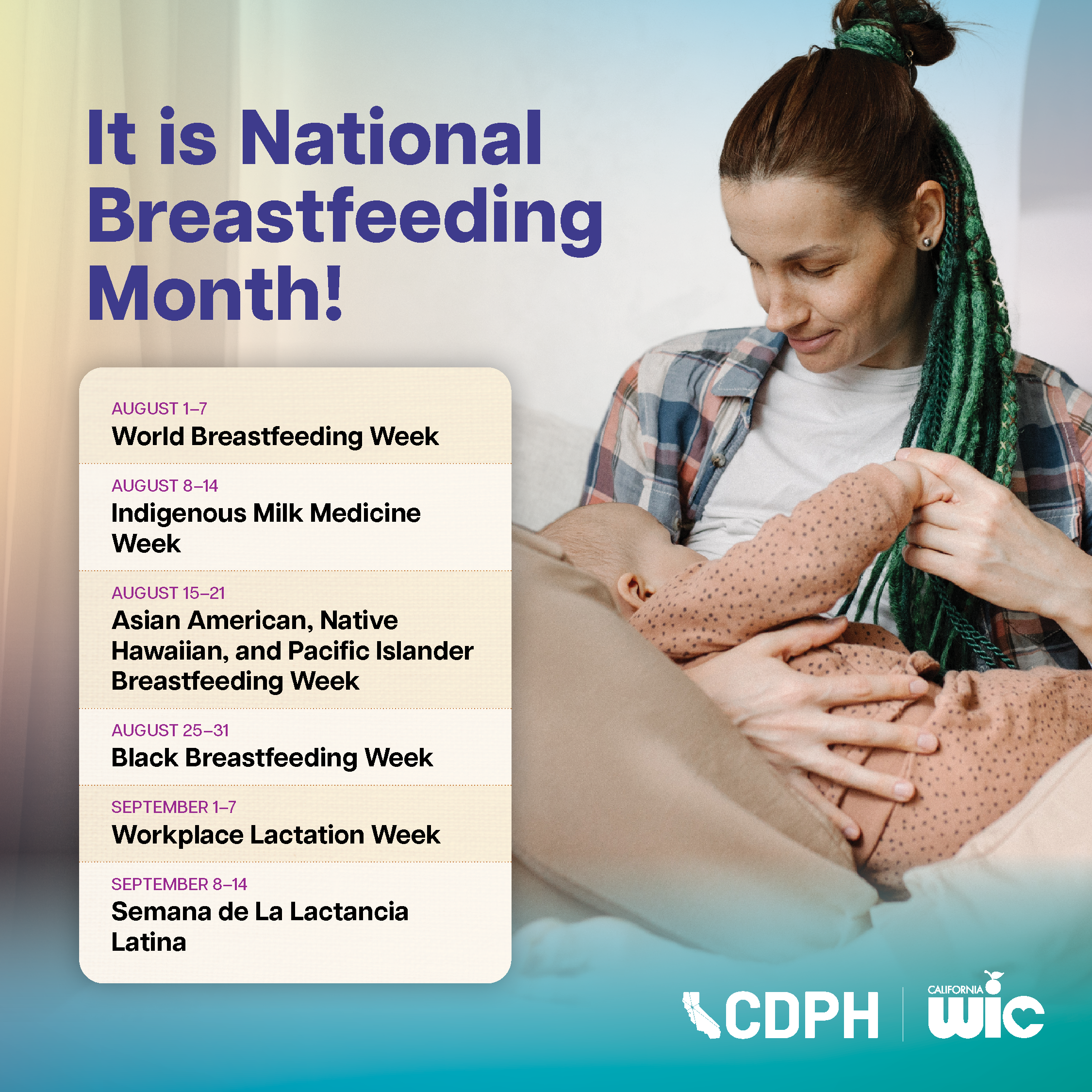 - Asian American, Native Hawaiian, and Pacific Islander (AANHPI) Breastfeeding Week (August 15–21)