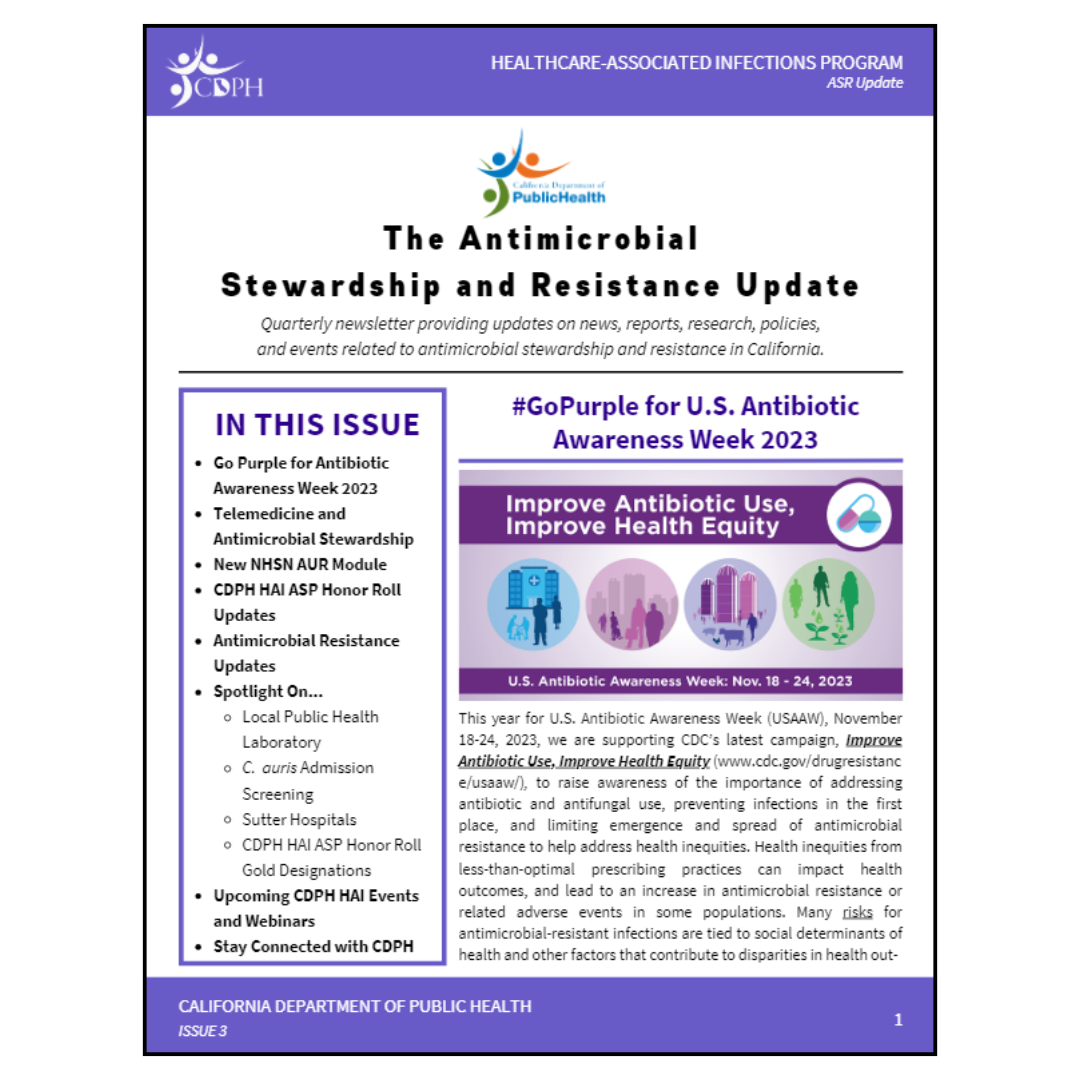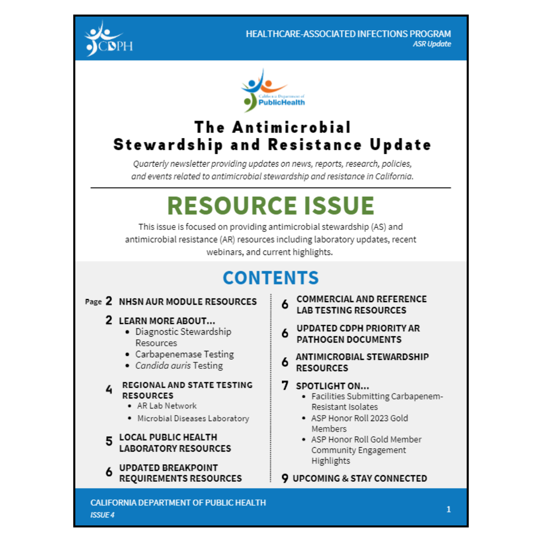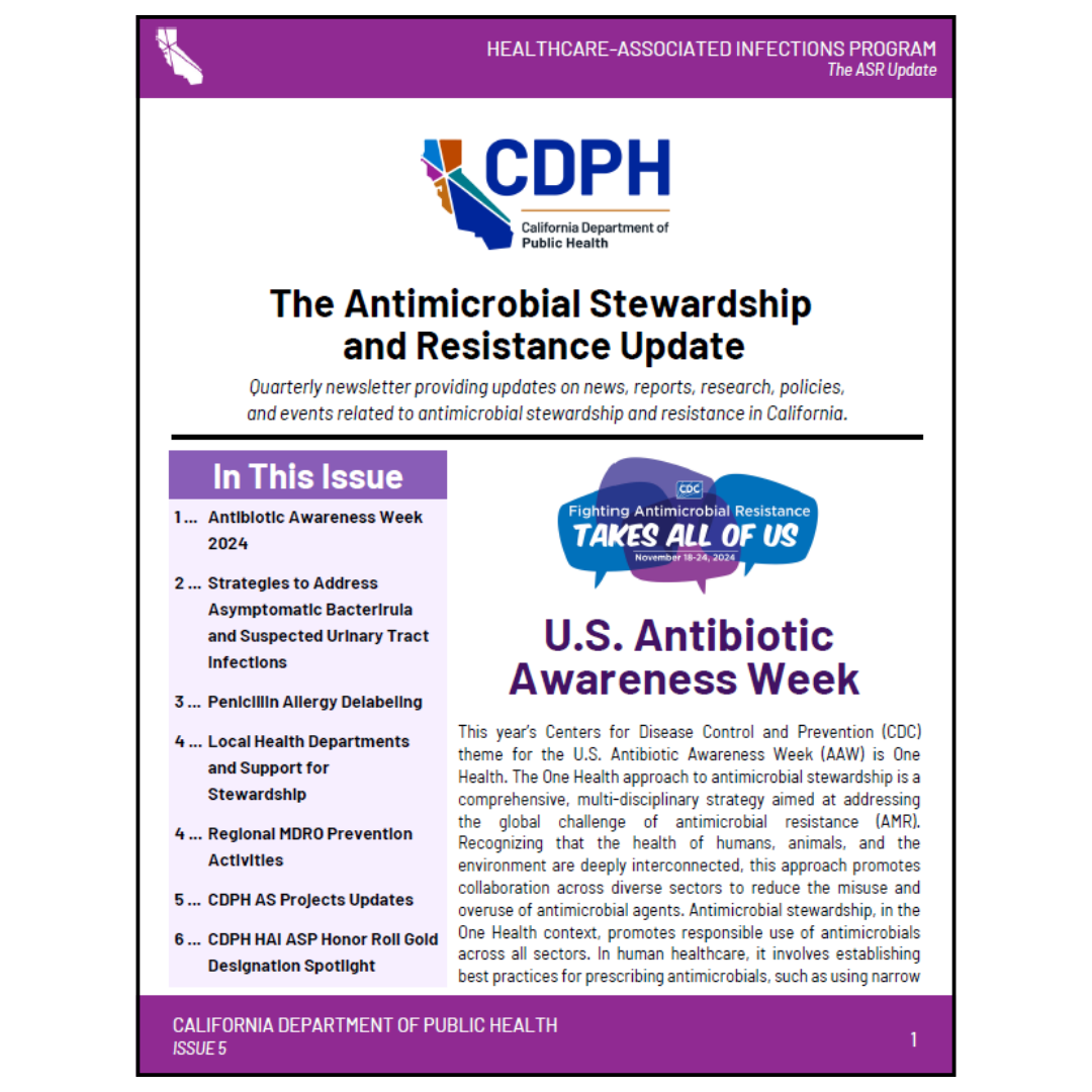 The Antimicrobial Stewardship and Resistance (ASR) Update is a biannual newsletter providing updates on news, reports, research, policies, and events related to antimicrobial stewardship and resistance in California.