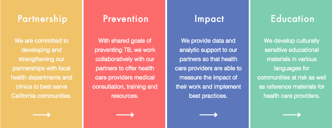 The TB Free California team is committed to reducing the burden of TB in California by partnering with organizations to increase awareness, testing and treatment, particularly for communities who are at high risk of developing TB.