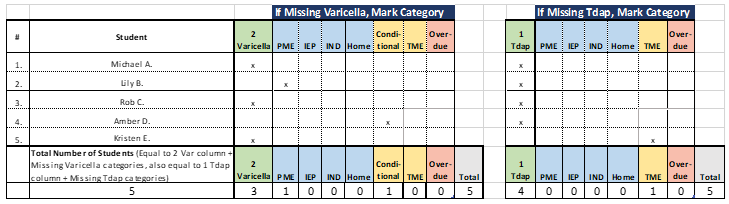 Use the worksheet to tally the immunization status of each student. List each student and check the designated box of their status for Tdap.