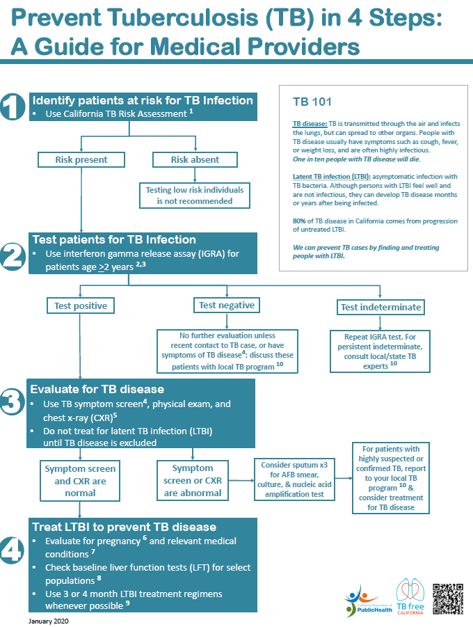 Tuberculosis (TB) remains a significant public health challenge in California. The majority of cases of tuberculosis disease in California (86%) arises from progression of untreated latent TB Infection (LTBI). Over 2 million Californians have LTBI and most are unaware of their infection and untreated. This page contains provider resources and tools to help health care providers identify, test for, and treat latent tuberculosis infection and prevent active tuberculosis disease.
