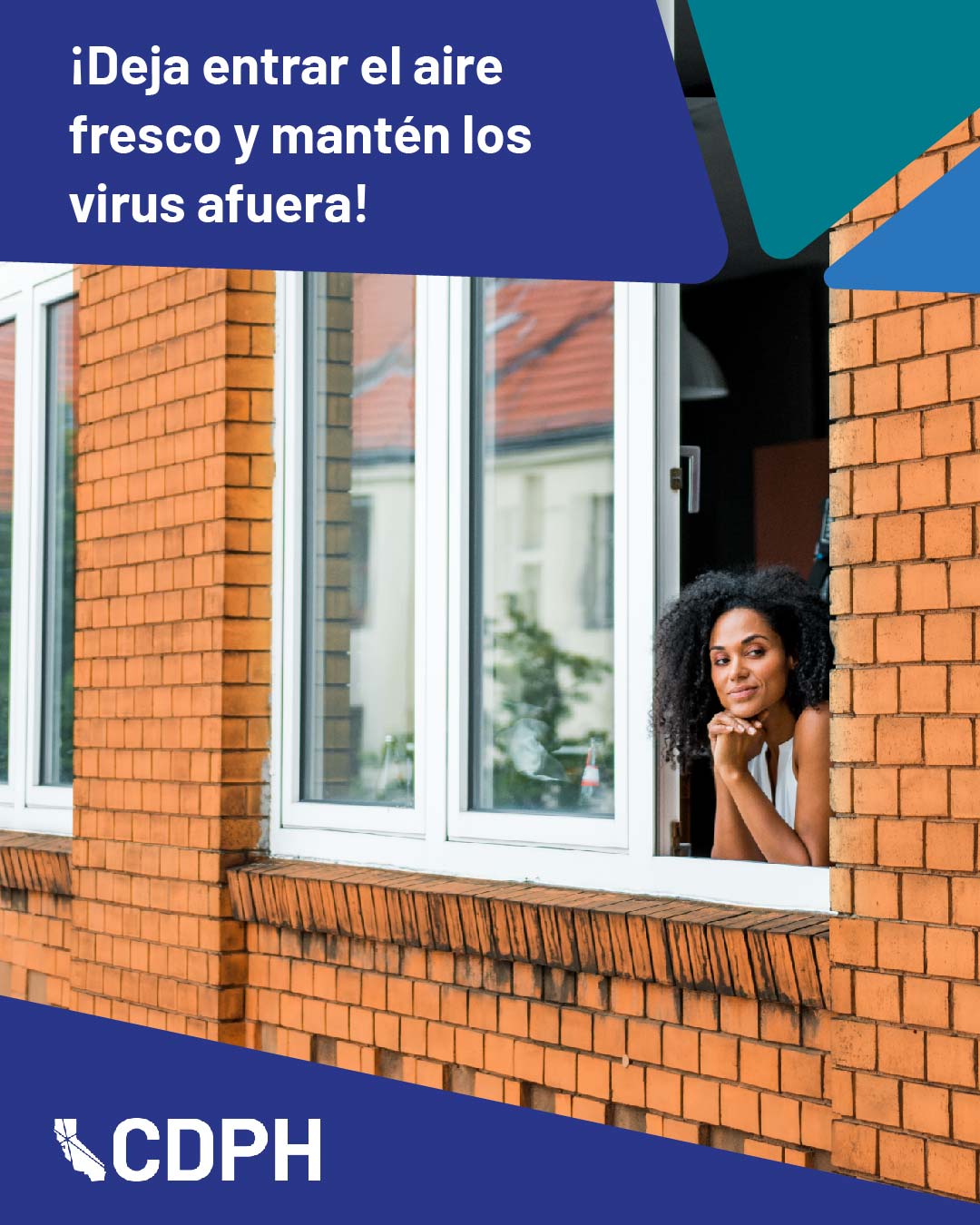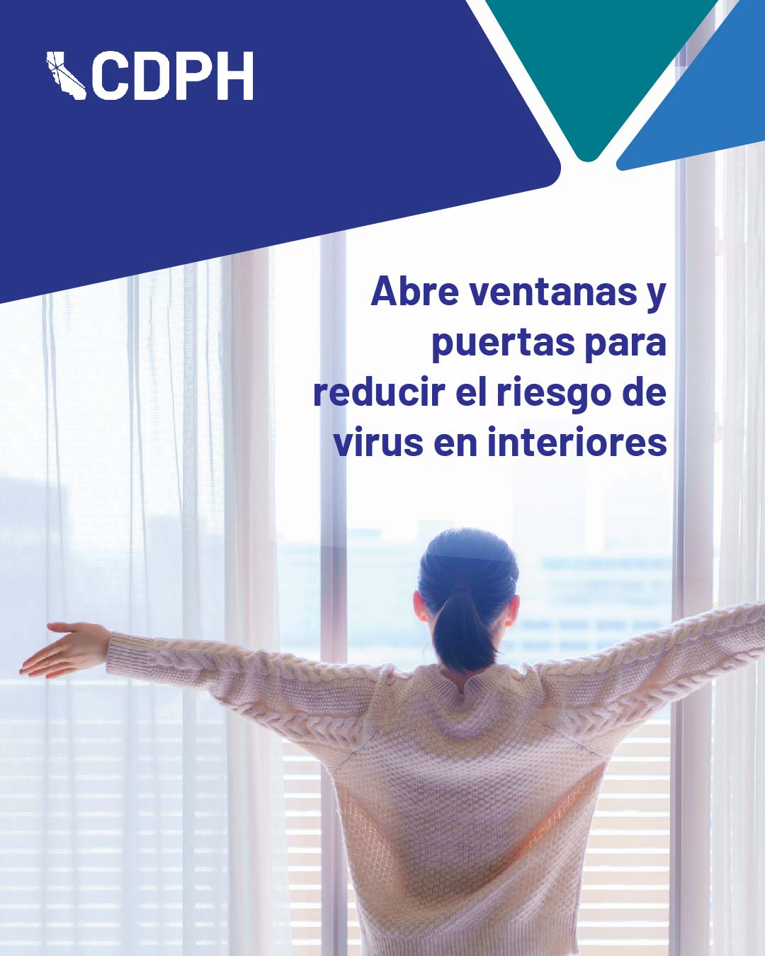 Suggested messaging: If the air quality is safe outside, open windows and doors to allow fresh air inside and prevent viruses from building up. Learn more about reducing virus risk indoors: go.cdph.ca.gov/indoor-air-quality