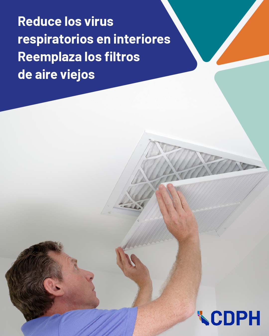 Suggested messaging: Reduce respiratory viruses (like COVID-19, flu and RSV) by replacing dirty air filters in your heating and air system. Learn more about reducing virus risk indoors: go.cdph.ca.gov/indoor-air-quality
