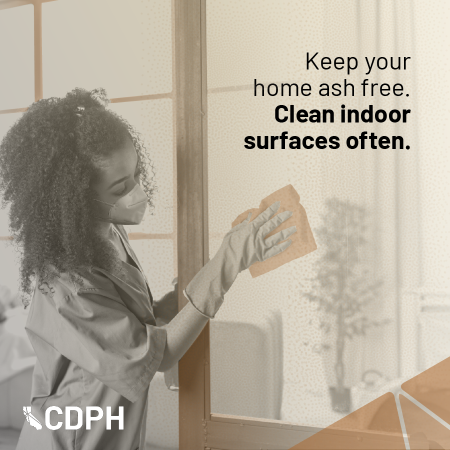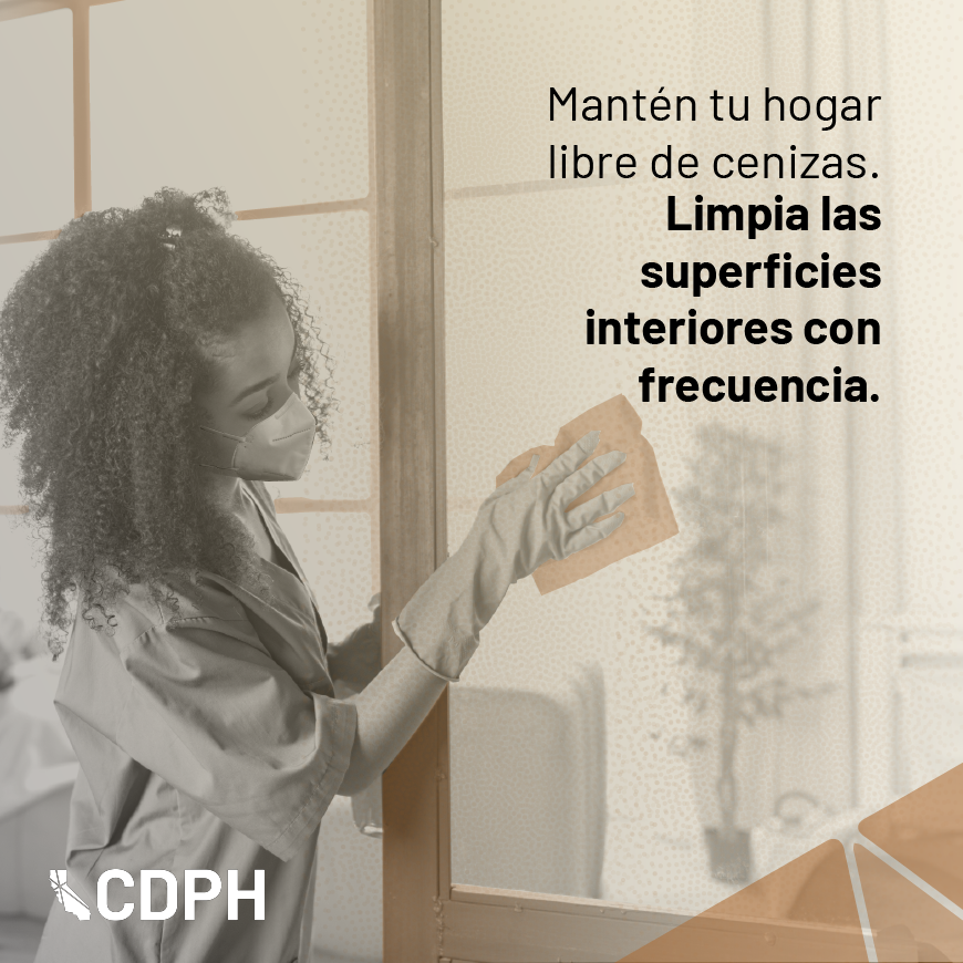 Las cenizas de los incendios forestales cercanos y las estructuras quemadas pueden llegar al interior de tu casa e irritar la piel, los ojos, la nariz y la garganta. Mantente a ti y a tu hogar seguros cuando limpies el interior: