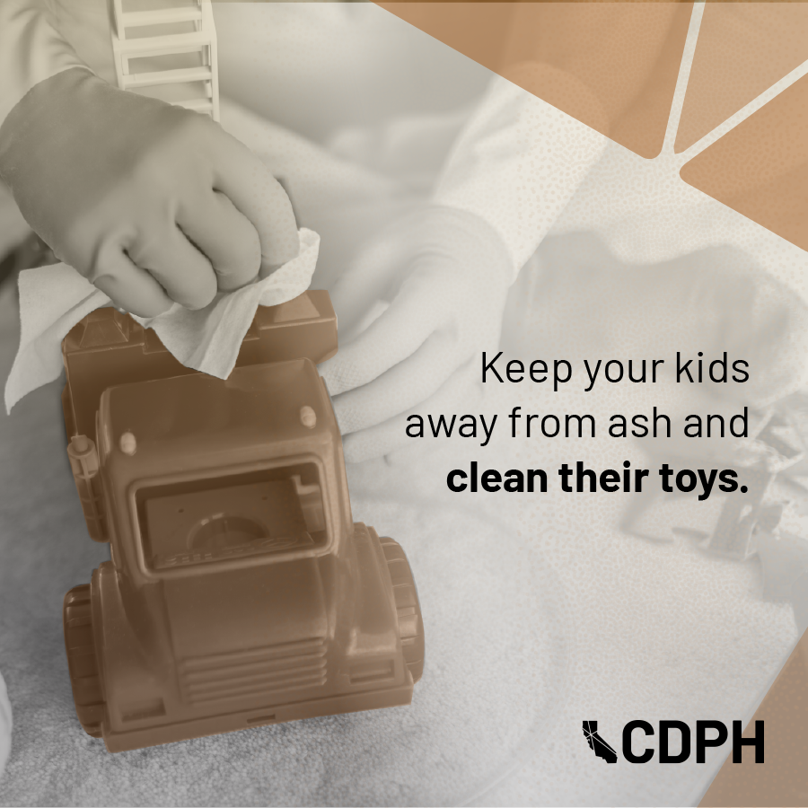 Las cenizas de los incendios forestales cercanos y las estructuras quemadas pueden causar problemas de salud. Mantén a los niños alejados de las cenizas y asegúrate de limpiar los juguetes que contengan cenizas antes de que tus hijos jueguen con ellos.