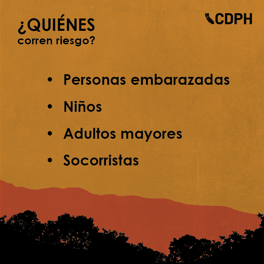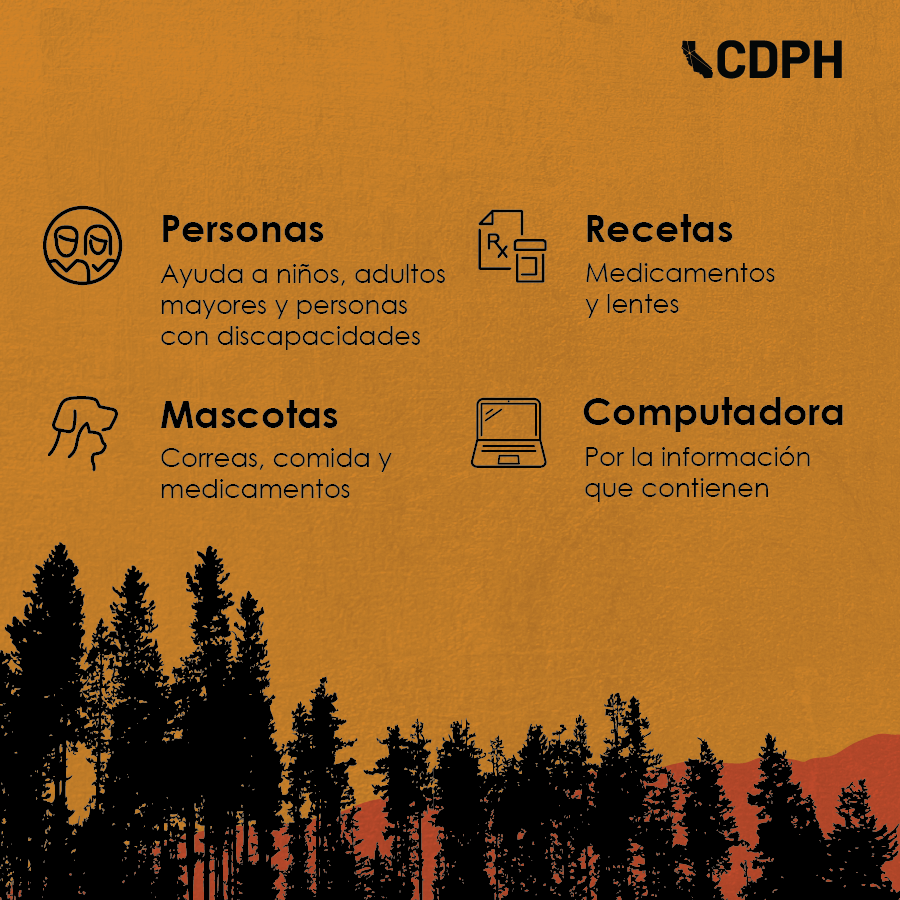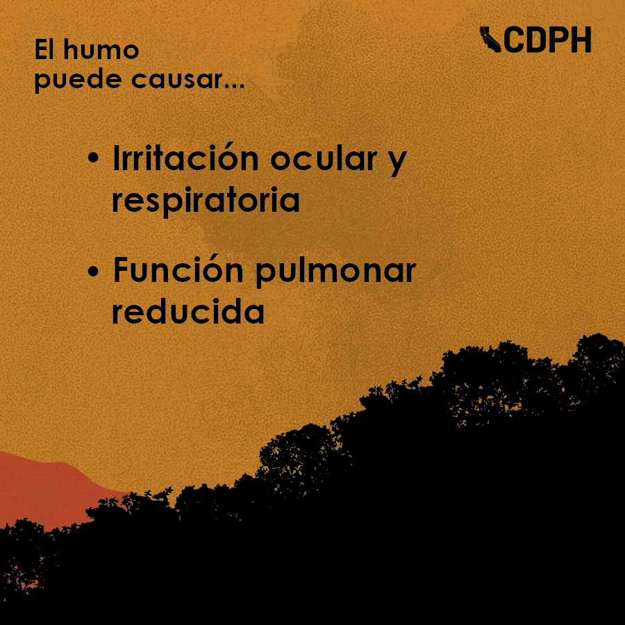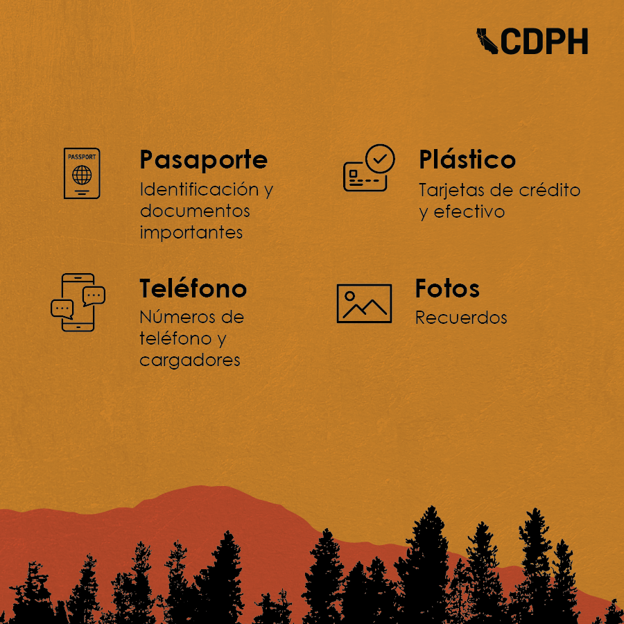 Obtén información sobre las mejores maneras de prepararte para los incendios forestales en https://www.cdph.ca.gov/Programs/EPO/Pages/Wildfire%20Pages/Wildfires--.aspx