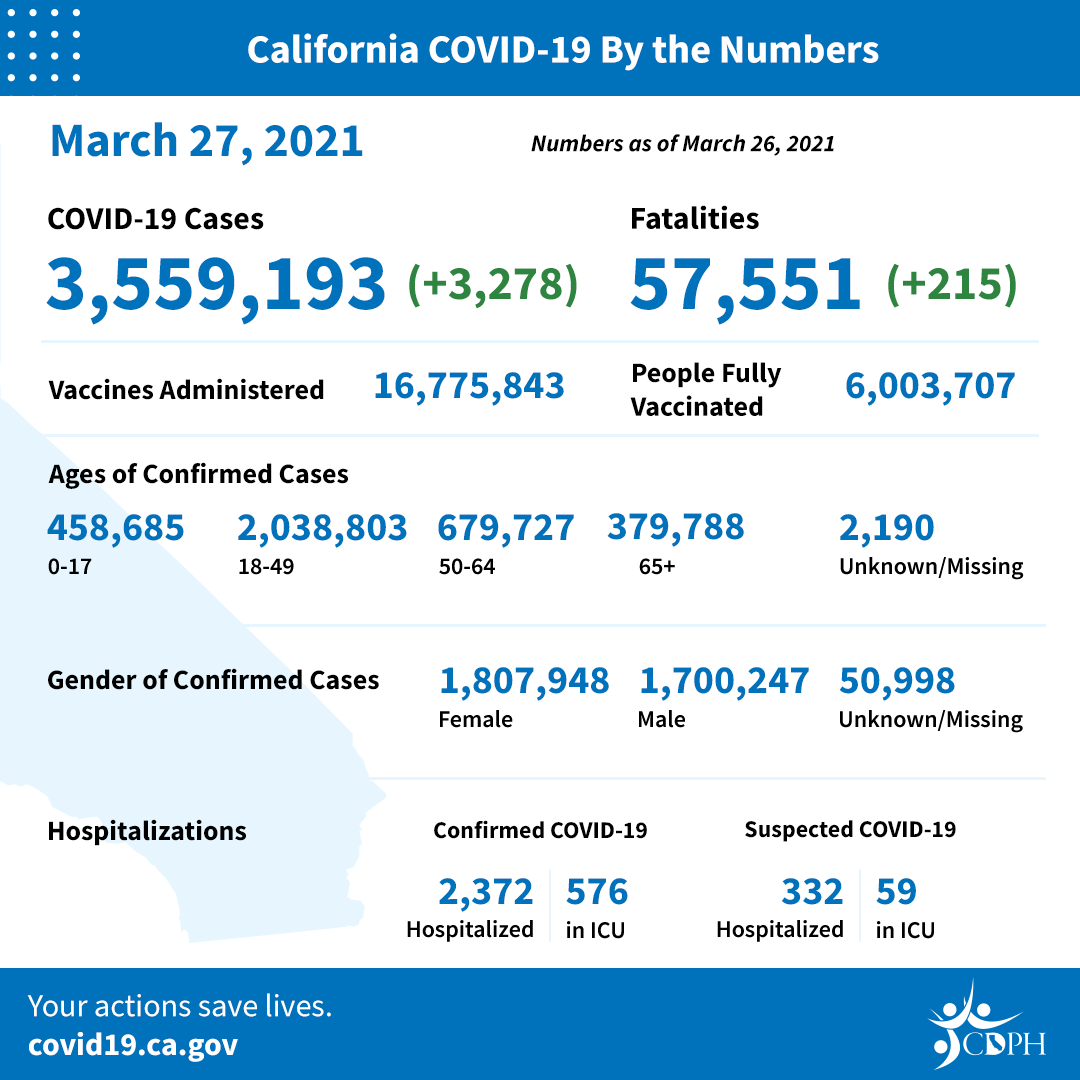 With supply of vaccines expected to significantly increase in the coming weeks, the state is expanding vaccine eligibility to more Californians. Starting April 1, individuals aged 50+ will be eligible to make an appointment, and individuals 16+ will be eligible to make an appointment to be vaccinated starting on April 15. To sign up for a notification when you're eligible for a vaccine, please visit myturn.ca.gov. For more information on the vaccine effort, visit Vaccinate All 58.